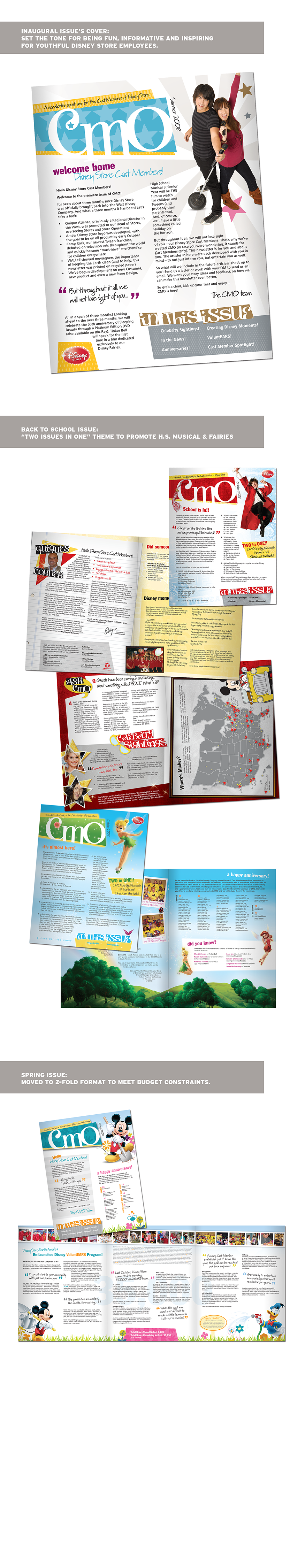 Internal communication from corporate headquarters to Disney Store employees in the field. Created concept, designed and art directed each issue.