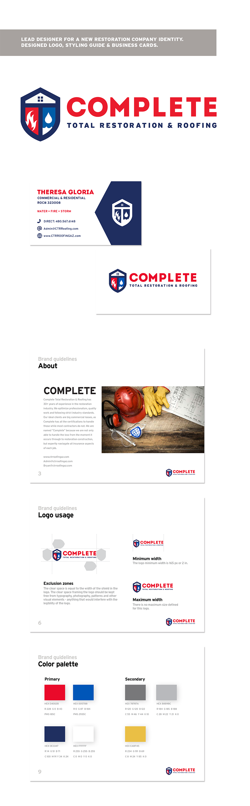 Lead designer for new local restoration & roofing company. Created identity, business cards and branding guide.