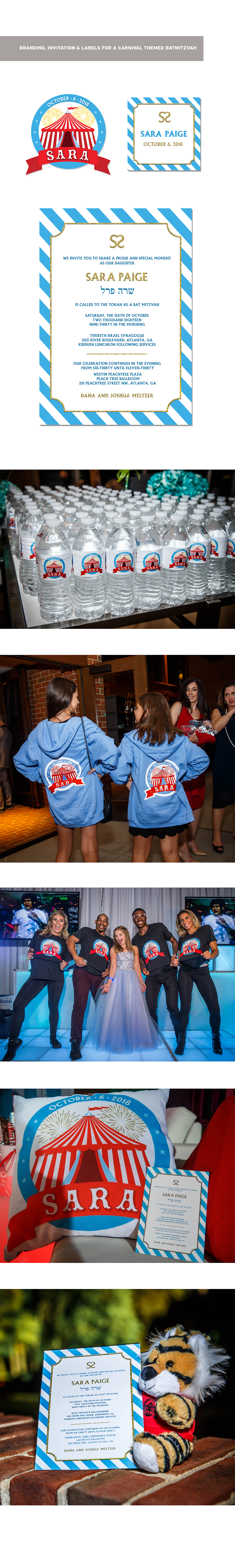 Digital Batmitzvah invitation designed for Greenvelope. Event logo designed for use on water bottles, favors, shirts, screens and more. Label designed for use on welcome bags and other favors.