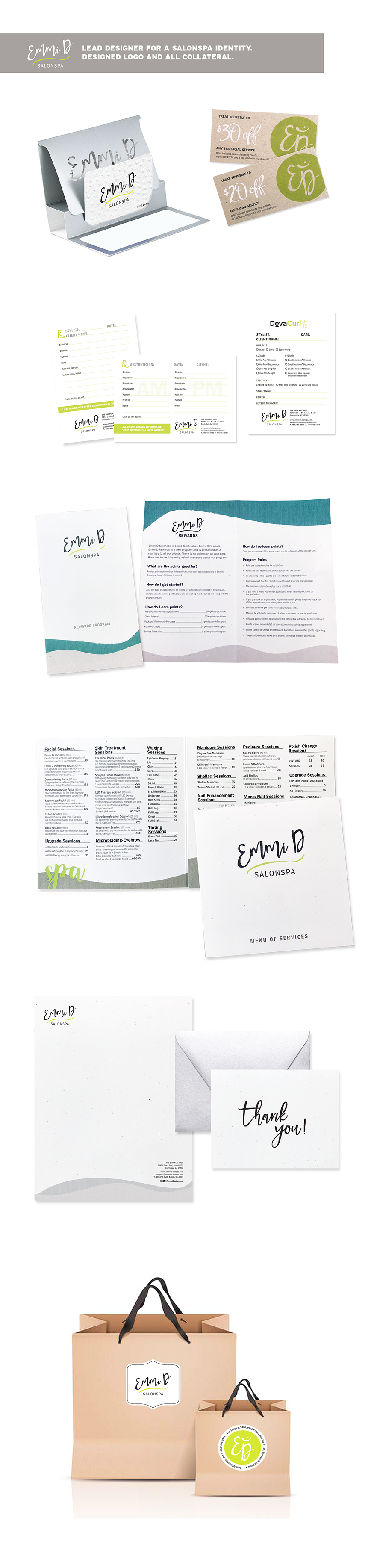 Lead designer on identity and all collateral for an upscale Salon and Spa. Created gift cards, coupons, menus, brochures, prescription pads, letterhead, thank you notes and retail bag labels.