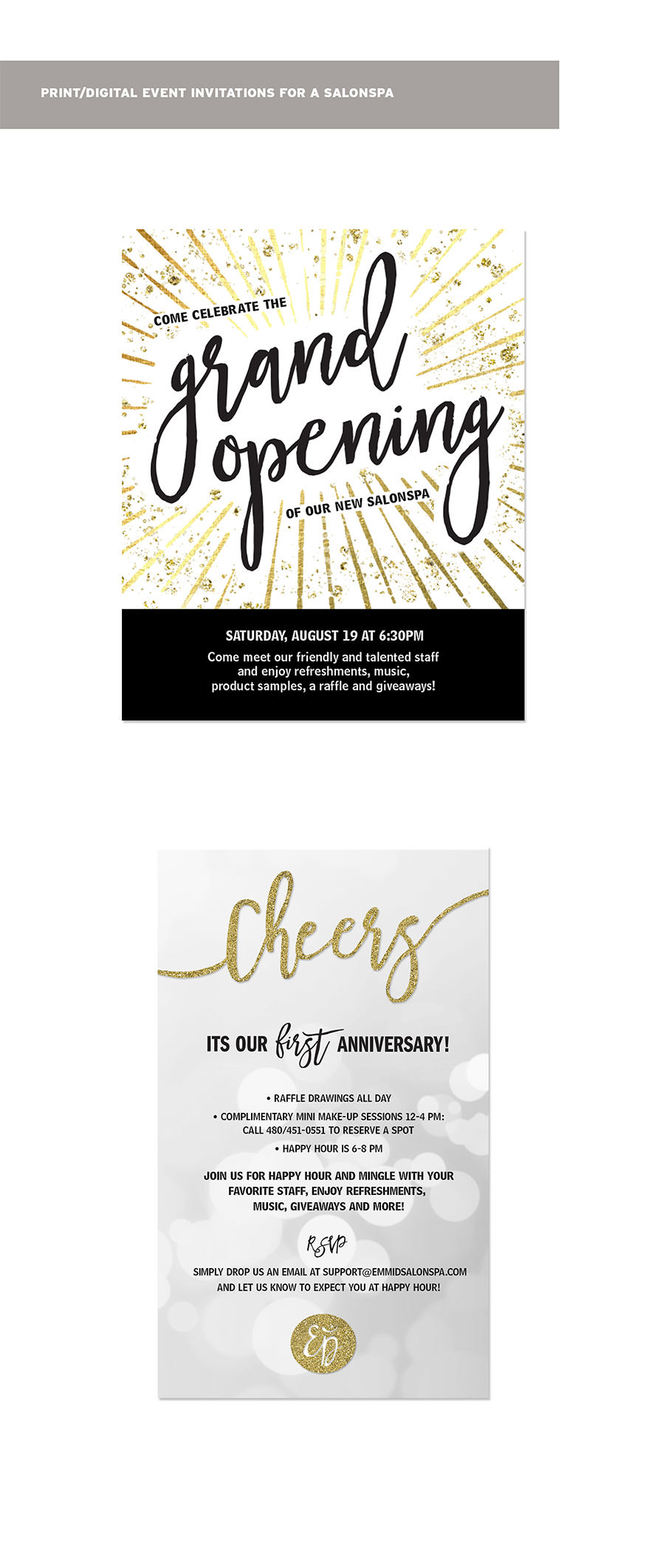 Designed print and social media grand opening and anniversary party invitations for an upscale Salon and Spa.