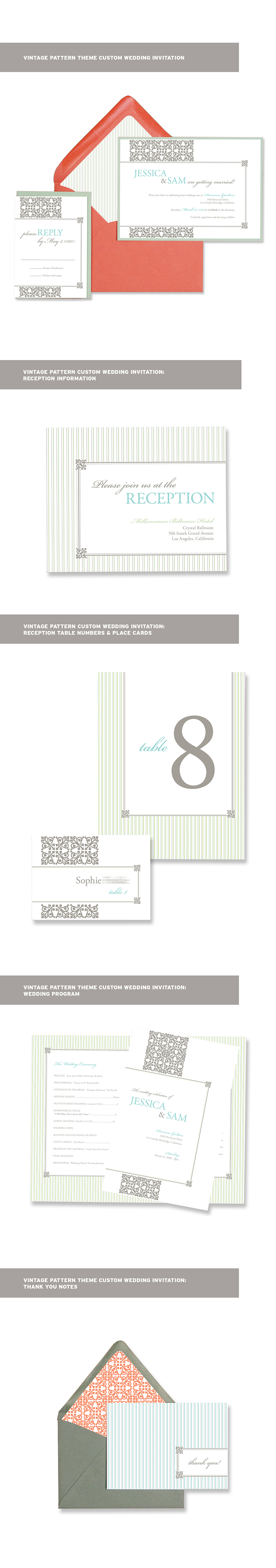 Concepted, Designed and Illustrated wedding invitations with a vintage inspired design and contrasting pinstripes
